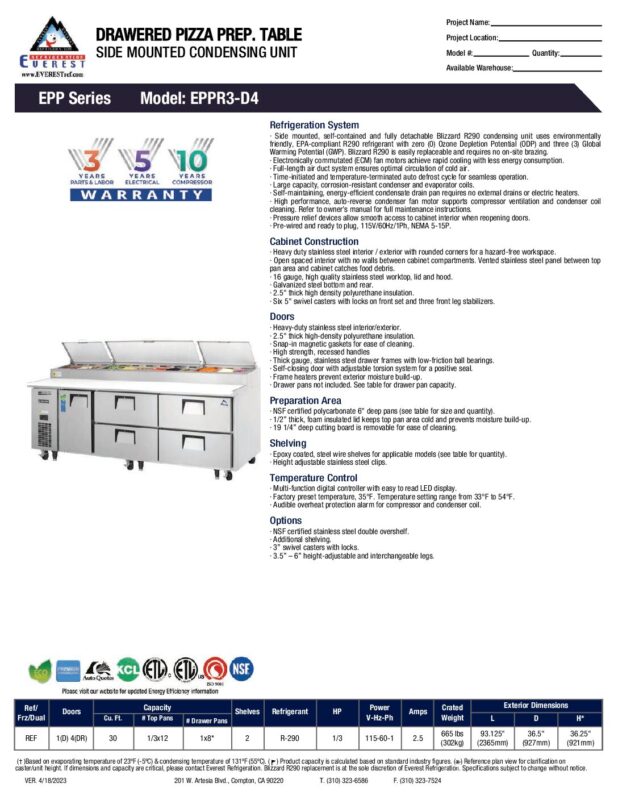 EverestEPPR3-D4SpecSheet2024 Ryan Jacobs Everest Refrigeration EPPR3-D4 93.125 Inch Three Section One Door And Four Drawer Side Mount Pizza Prep Table 30 Cubic Feet, Free Shipping