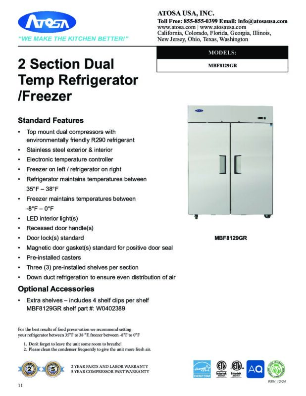 MBF8129GR_Specsheet_12112024-2 Ryan Jacobs Atosa MBF8129GR 52″ 2 Section Dual Combination Temp Refrigerator & Freezer Combination, Free Shipping