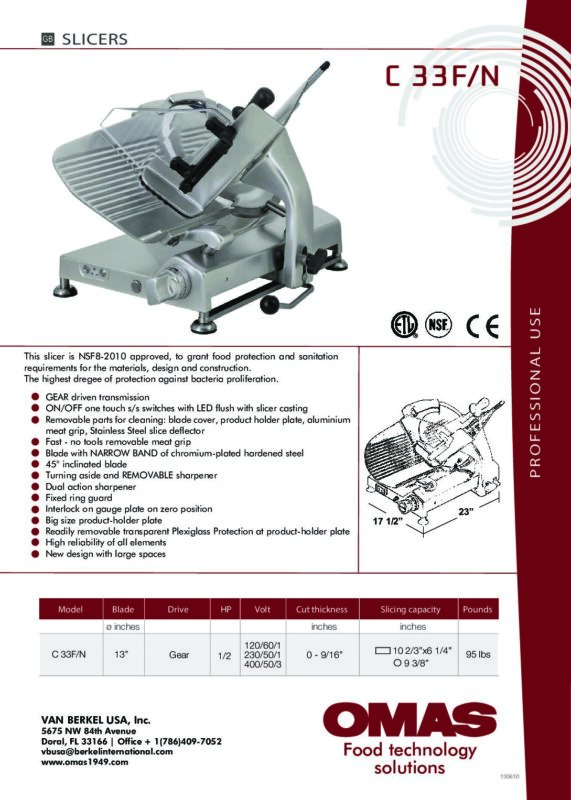 OMAS – C33E_N-C33F_N – Data Sheet 2025 Ryan Jacobs Omas C 33F/N Manual Food Slicer w/ 13″ Blade, Gear Driven, Free Shipping