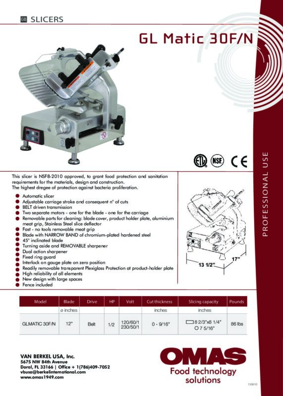 OMAS – GL-Matic 30E_N GL-Matic 30F_N – Data Sheet 2025 Ryan Jacobs Omas GL MATIC 30F/N Automatic Food Slicer w/ 12″ Blade, 400 watts, 1/2 hp, Free Shipping